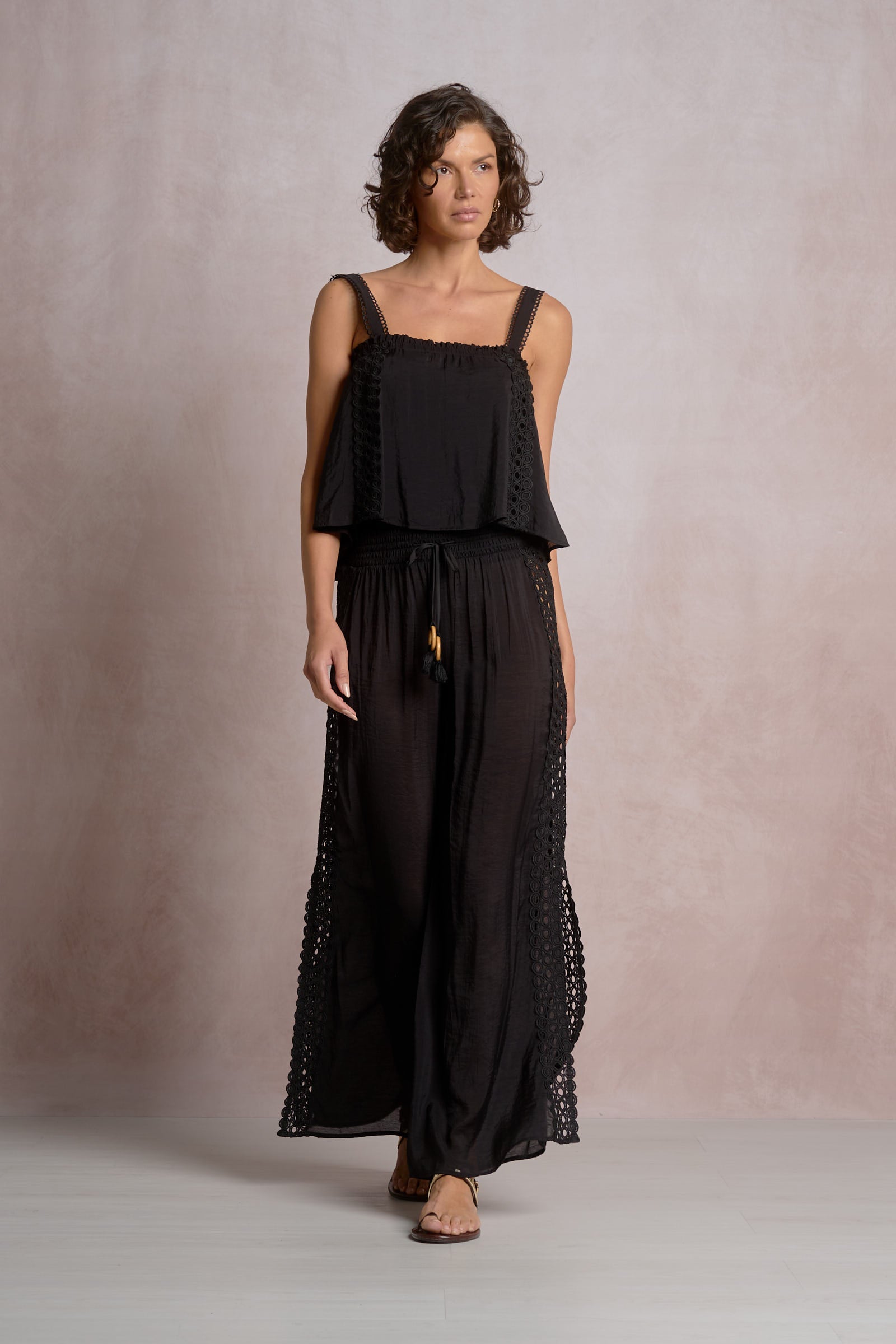 Whether you're pairing it with the matching Midnight Oasis Pants for a coordinated bohemian look, styling it with denim for casual chic, or tucking it into a skirt for elevated style, the Noir Coast Tank delivers that perfect combination of effortless comfort and sophisticated charm. The beautiful crochet lace detailing adds a touch of artisanal elegance while the relaxed fit keeps you comfortable all day long.