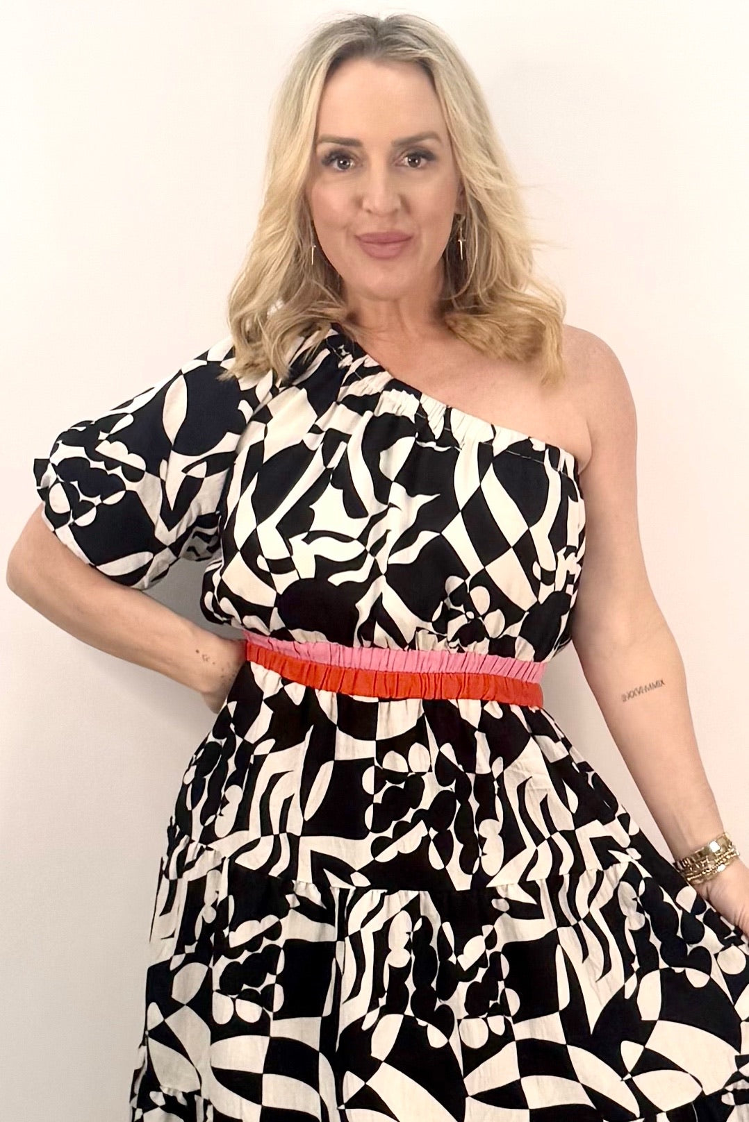 Details: 80% Rayon, 20% Nylon | One Shoulder | Puff Sleeve Detail | Abstract Print | Maxi Length | Tiered Design | Belted | Black & White