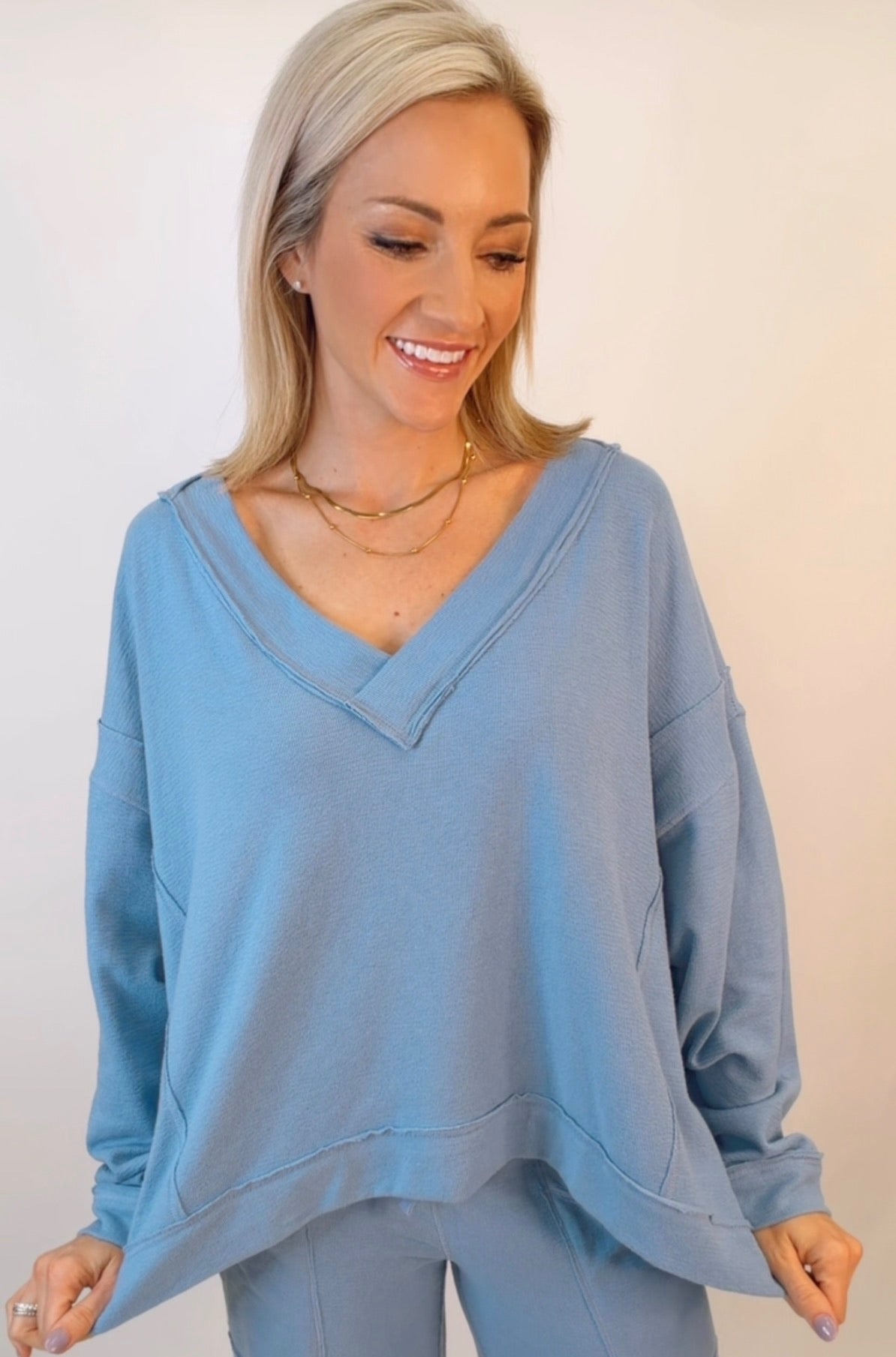 Details: 59% Cotton, 41% Polyester | Relaxed Fit | V-Neckline | Soft Knit Construction | Dropped Shoulders | Color: Blissful Blue
