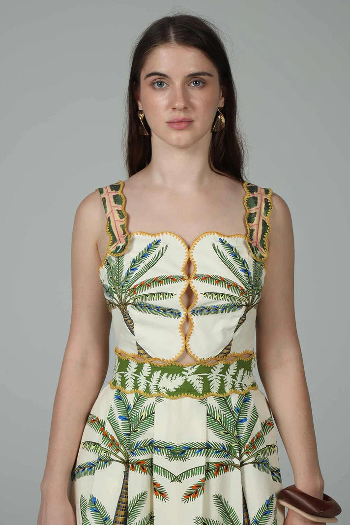 Details: 100% Cotton | Tropical Print | Cut-Out Details | Midi Length | Color: Nirvana