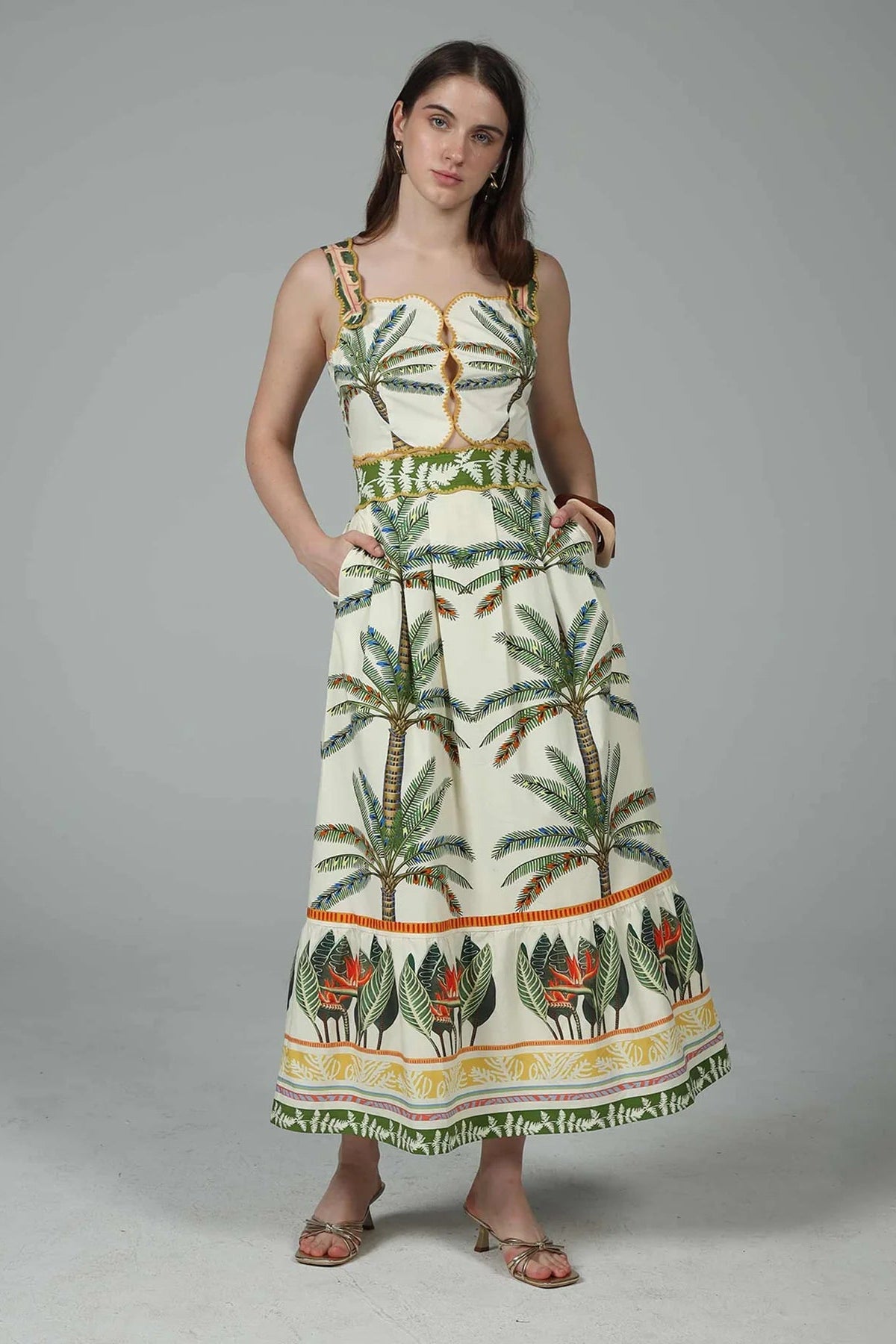 Whether you're pairing with strappy heeled sandals and gold jewelry for a polished summer evening, styling with flat sandals and a woven tote for a breezy daytime look, or wearing with white sneakers for a casual, fashion-forward everyday outfit, the Sydney Tropical Print Cutout Midi Dress delivers that perfect combination of bold tropical energy and refined feminine detail. A dress that makes a statement in the best possible way.