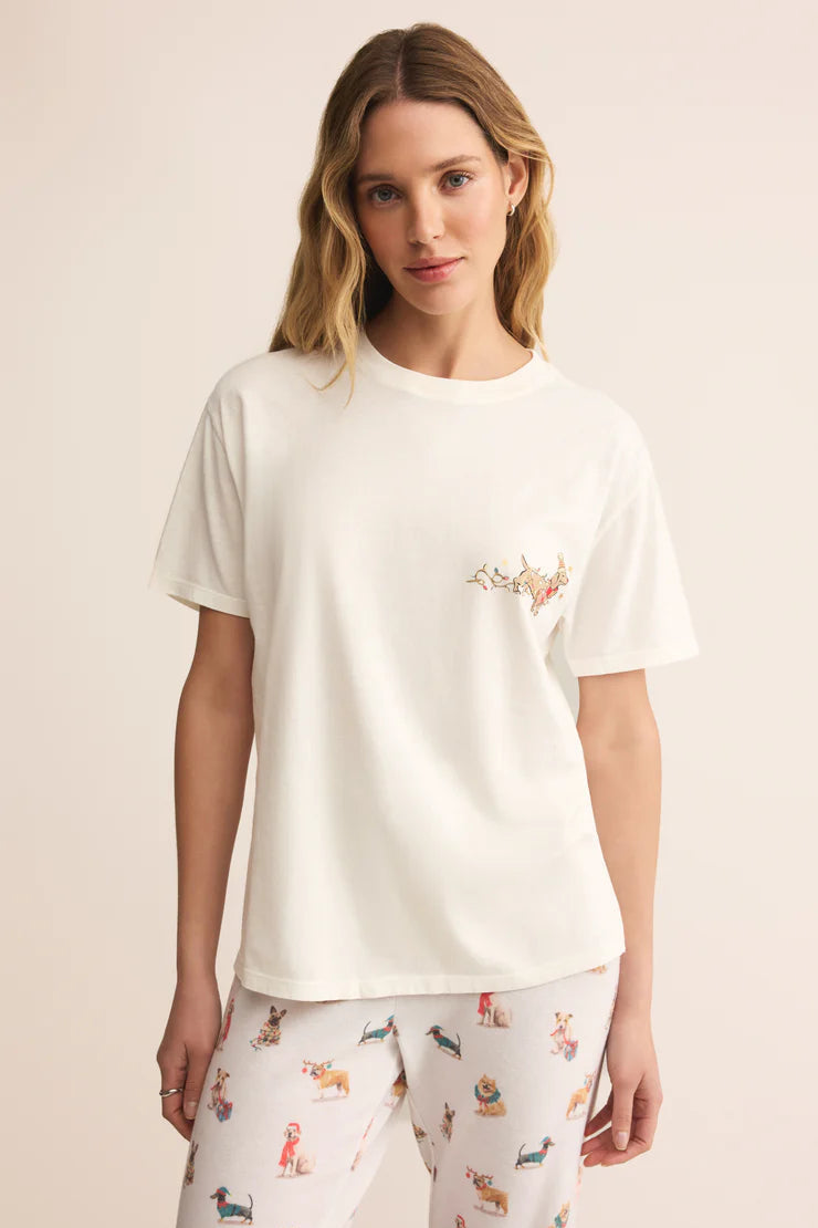 Made using our loose-knit cotton jersey, this tee has an easy drape and a relaxed, borrowed-from-him fit. A playful holiday screen print with gold foil detail makes it a casual favorite you’ll keep reaching for.