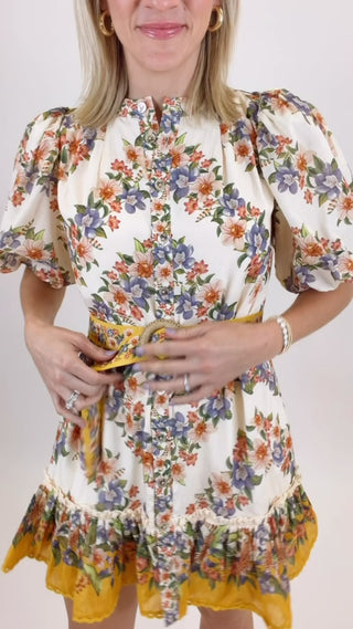 Details: 53% Cotton, 47% Viscose | High Neckline | Short Sleeves | Center Front Button Closure | Handwoven Stripes | Mini Length | Warm Sandy Tones