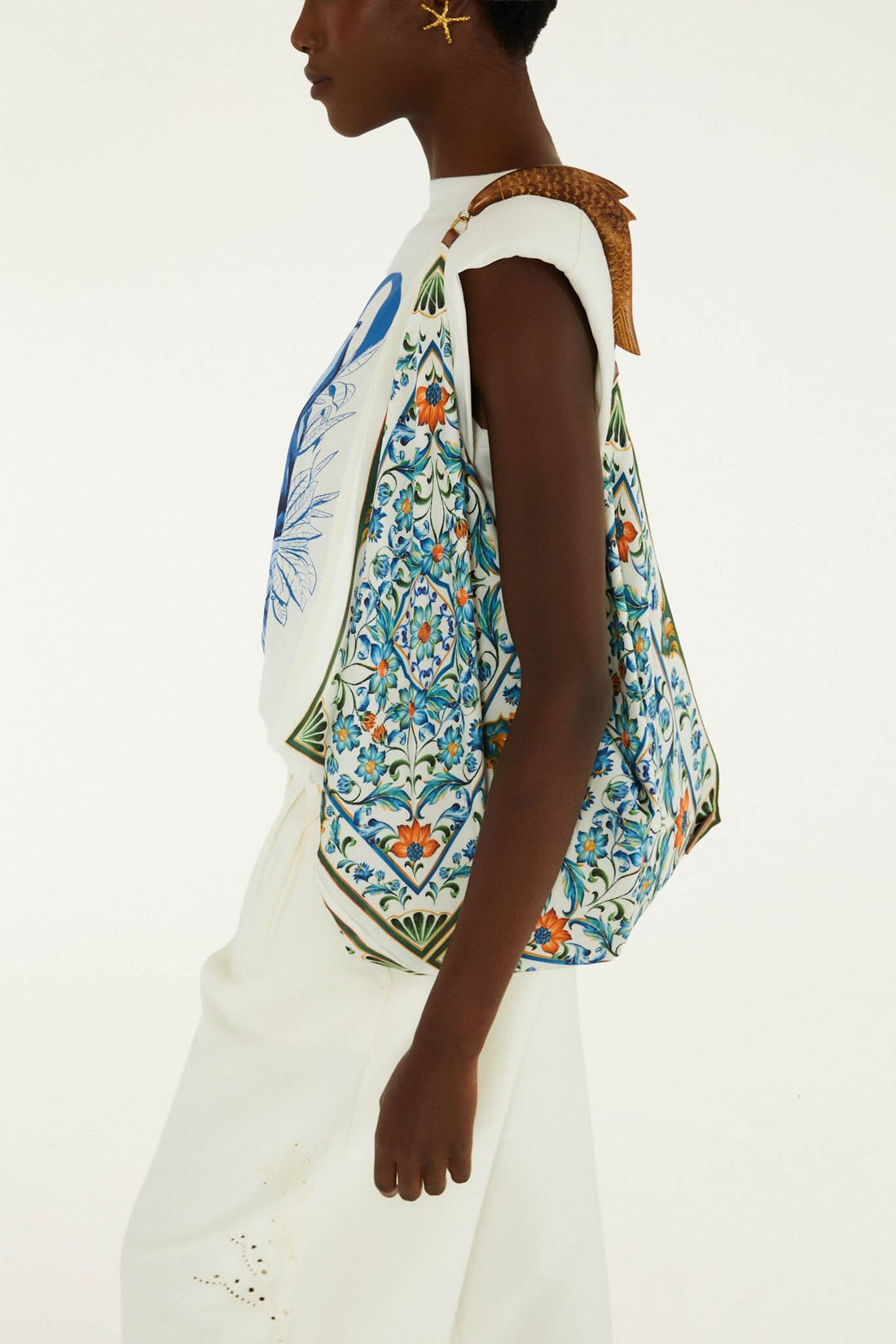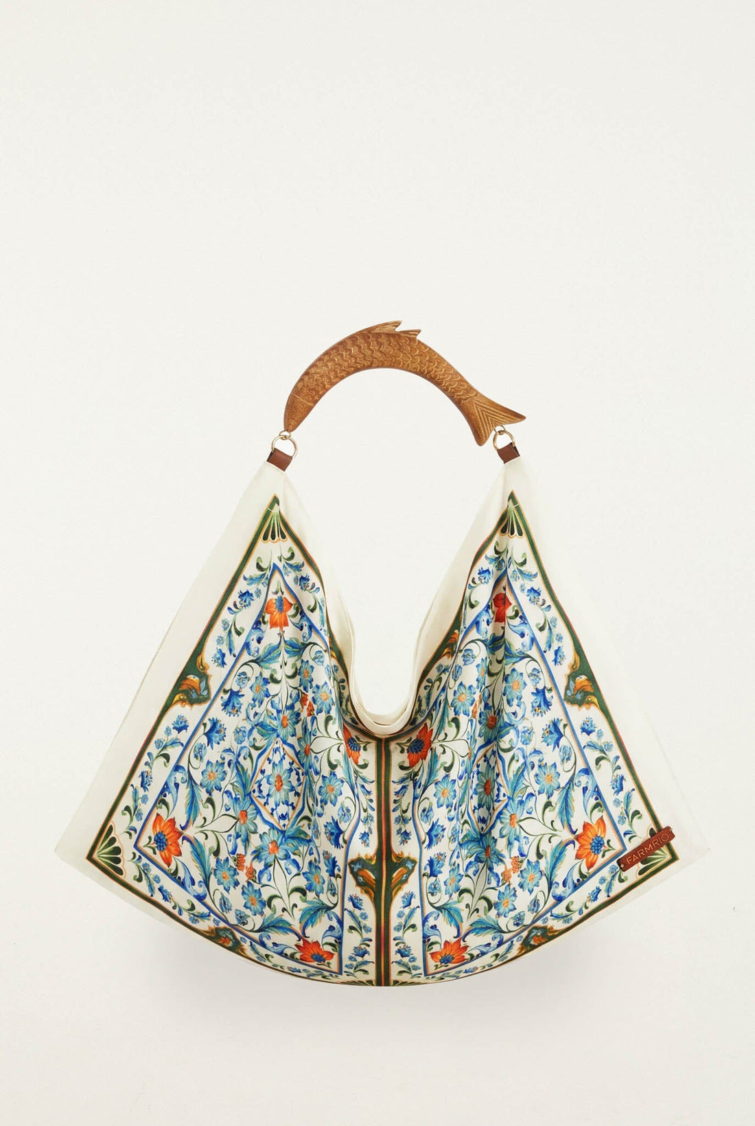 Brazilian sunshine, bottled in a bag. The Off-White Flowers Satin Scarf Medium Bag in Flora Tile is a FARM Rio signature piece that captures the brand's vibrant, joyful spirit — silky satin fabric adorned with a vibrant floral tile print in sun-kissed hues, a playful scarf-inspired detail that dances with every step, and a smooth wooden handle that adds a natural, artisanal finishing touch.