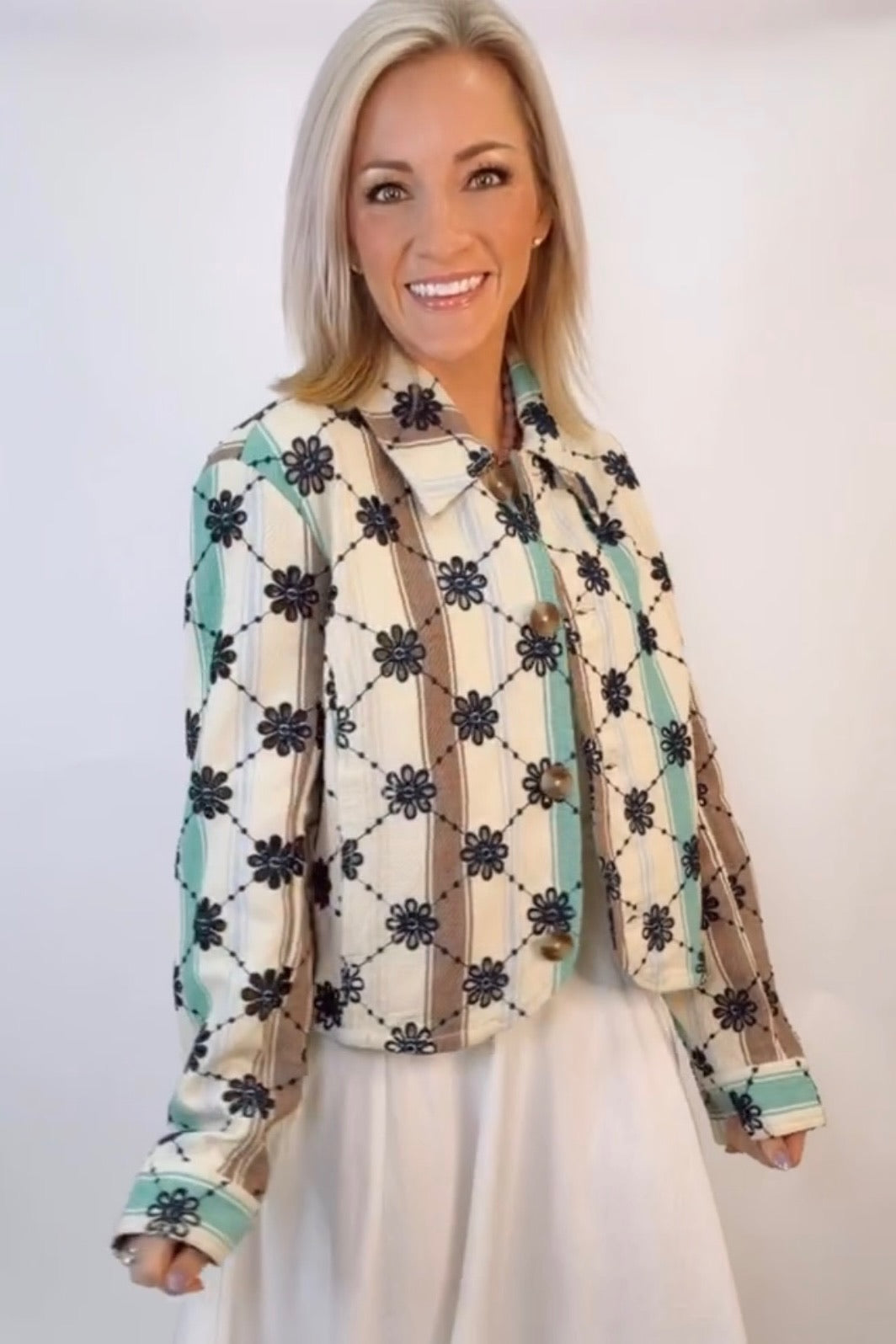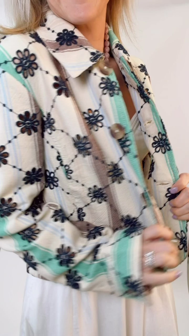 Details: 100% Cotton | Button-Front Closure | Long Sleeves | Collared Neckline | Cropped Boxy Silhouette | Embroidered Details | Color: Ivory Combo