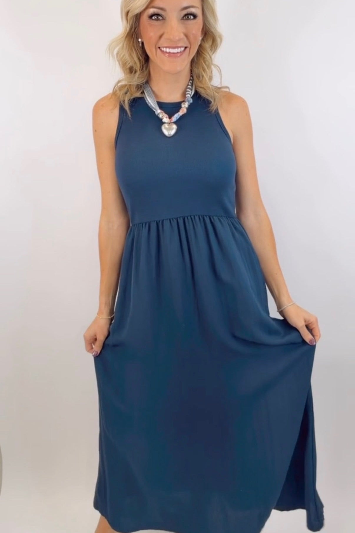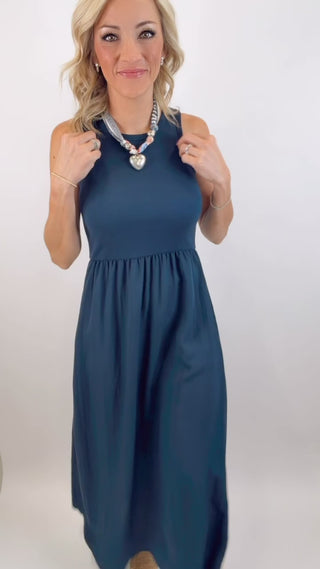 Details: 50% Cotton, 49% Modal, 1% Spandex | High Neck | Sleeveless | Wide Straps | Side Pockets | Lightweight | Midi Length | Length: 52"