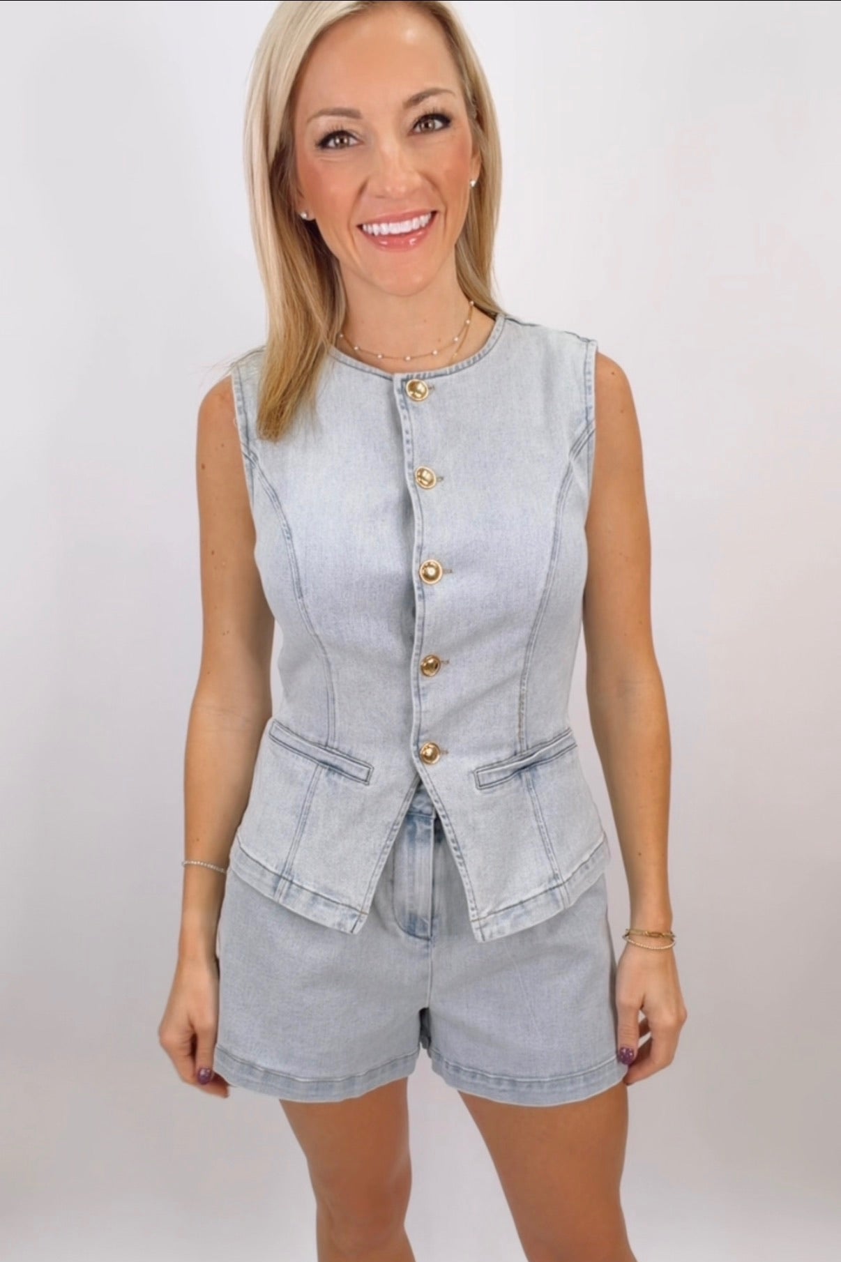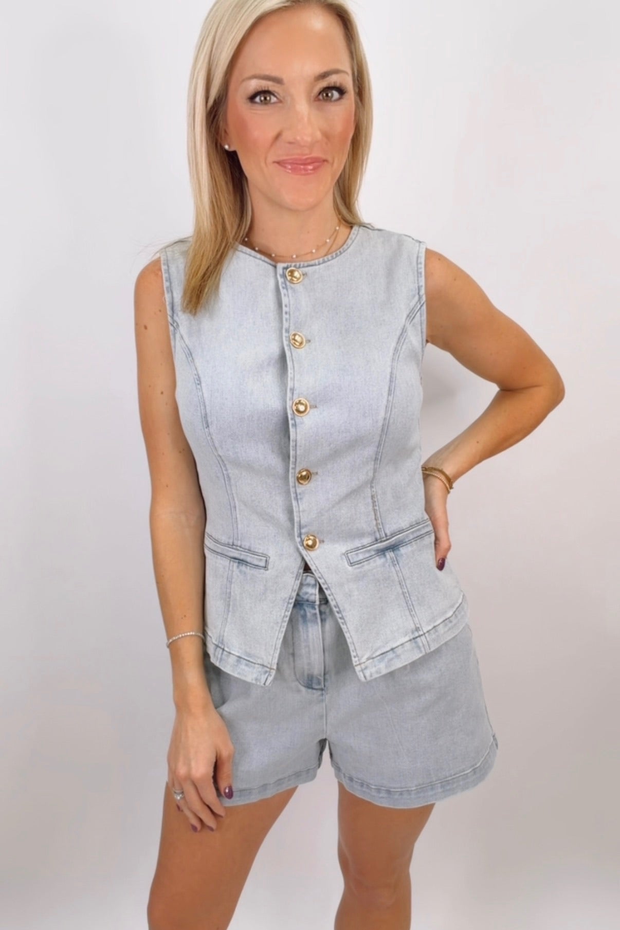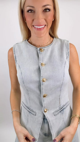 Upgrade your wardrobe with the Denim Button Vest from STMT Boutique. Designed for layering, this vest adds a stylish and versatile touch to any casual look. Pair it with dresses, shirts, or tops for a trendy, polished outfit.