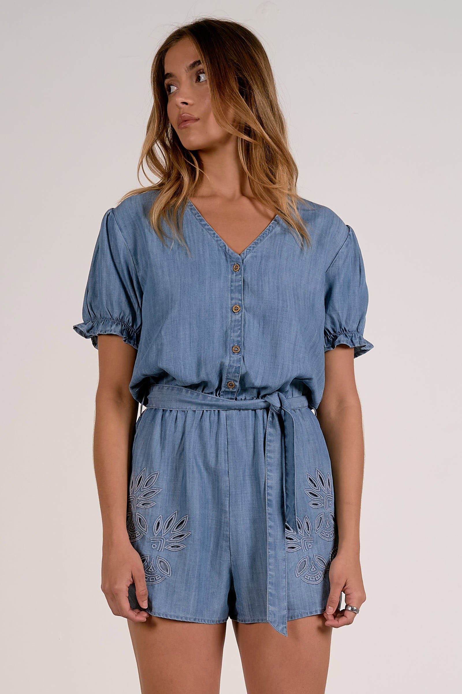 Denim with a romantic twist. The Denim Daylight Romper in Denim is a beautifully detailed chambray romper by ELAN that elevates everyday denim dressing — a V-neckline, button-front placket with antique gold buttons, puff sleeves with ruffled elastic cuffs, an elastic waist with a self-tie belt, and shorts adorned with stunning tonal embroidered floral and leaf cutwork detailing that makes this romper anything but ordinary.