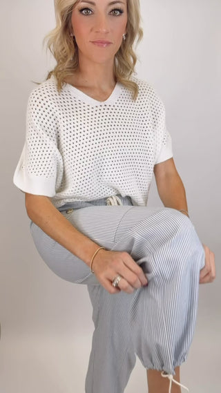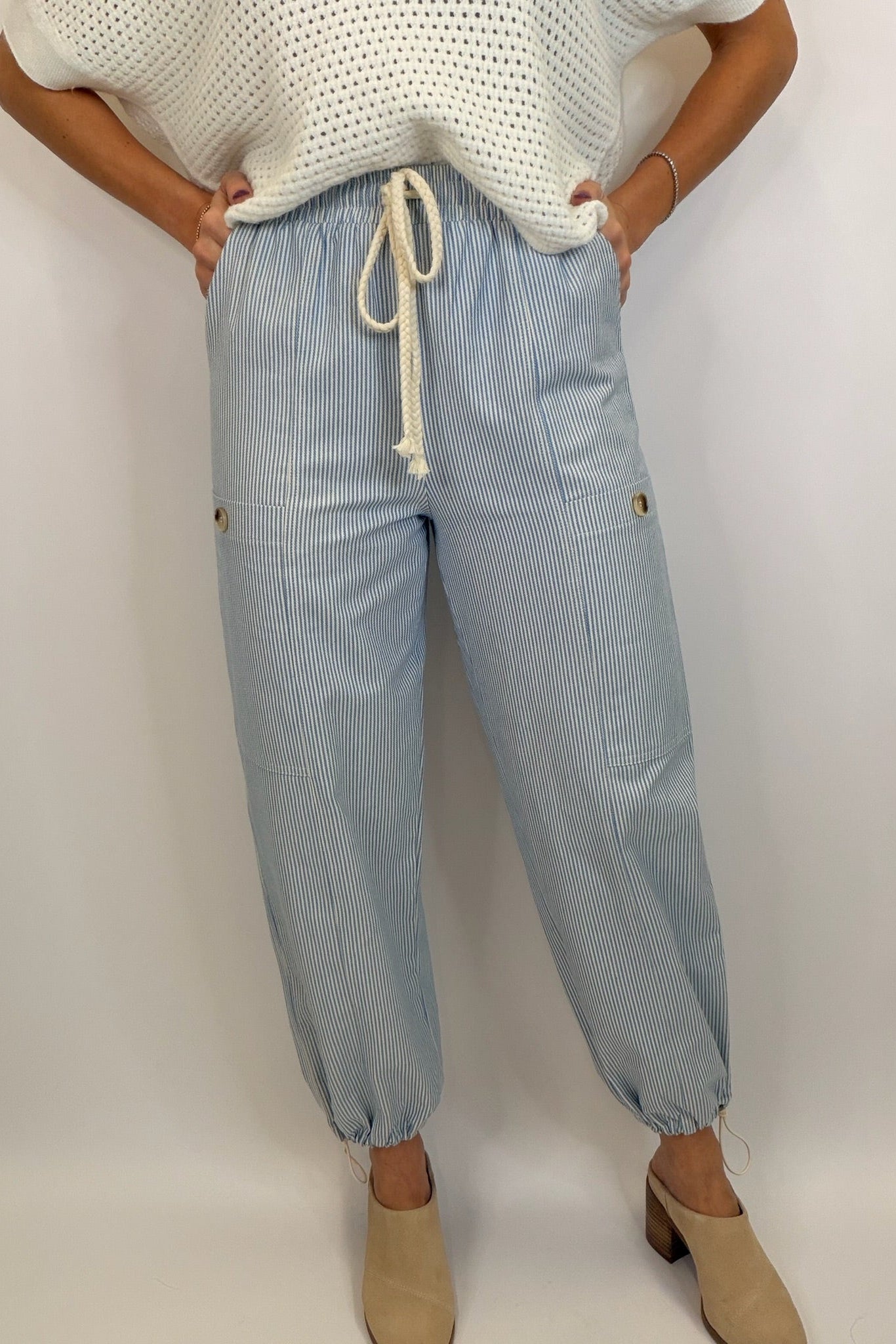 Details: Cotton & Linen | Striped Twill | Elastic Waistband with Cord Tie | Adjustable Jogger Hem | Relaxed Fit