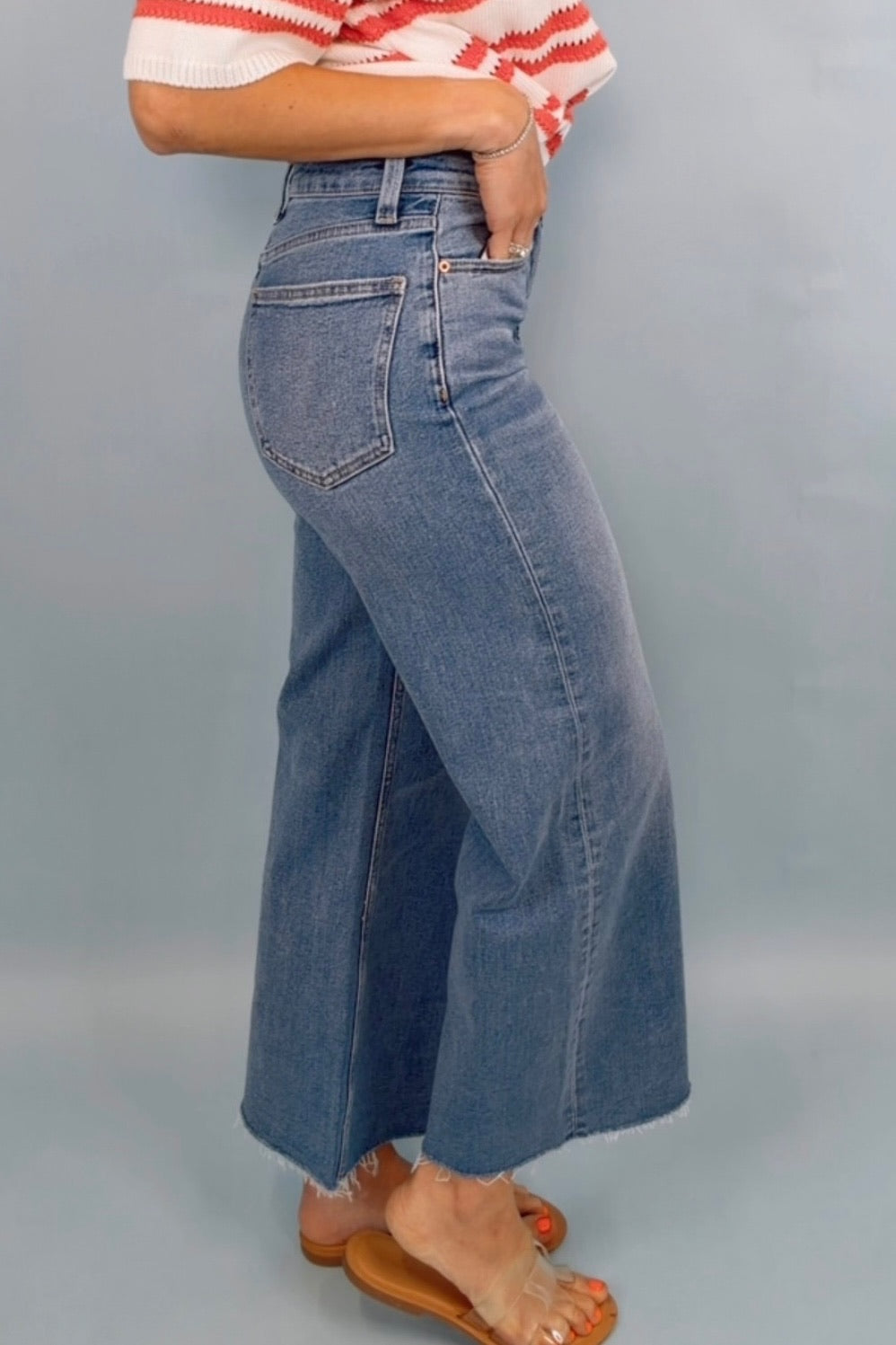 Details: 99% Cotton, 1% Spandex | Comfort Stretch | High Rise | Rise: 12" | Inseam: 27" | Leg Opening: 23" | Ultra Wide Leg | Cropped | Color: Wild Heart