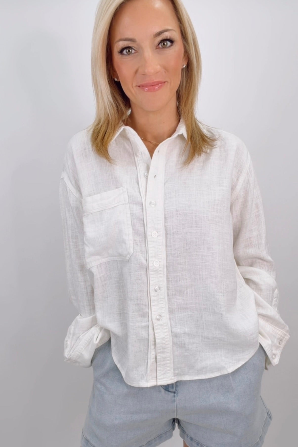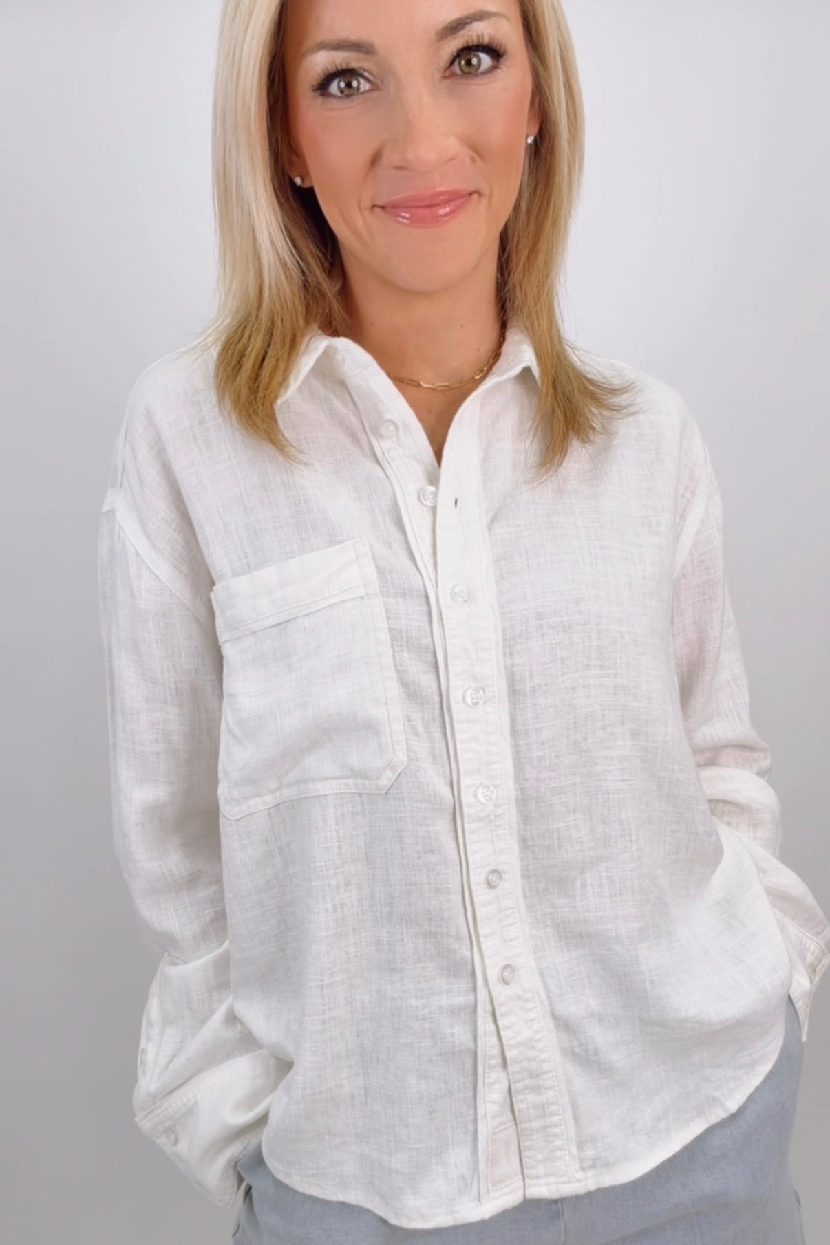 Details: 52% Linen, 48% Viscose | Collared Neckline | Long Sleeves | Button-Down | Patch Pocket | Relaxed Fit