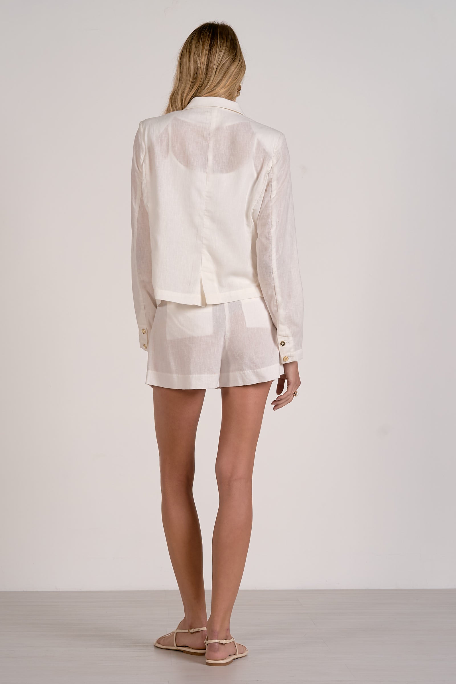 Details: Linen | Cropped Blazer | Classic Collar | Long Sleeves | Gold Button Cuffs | Center Back Vent | Color: White