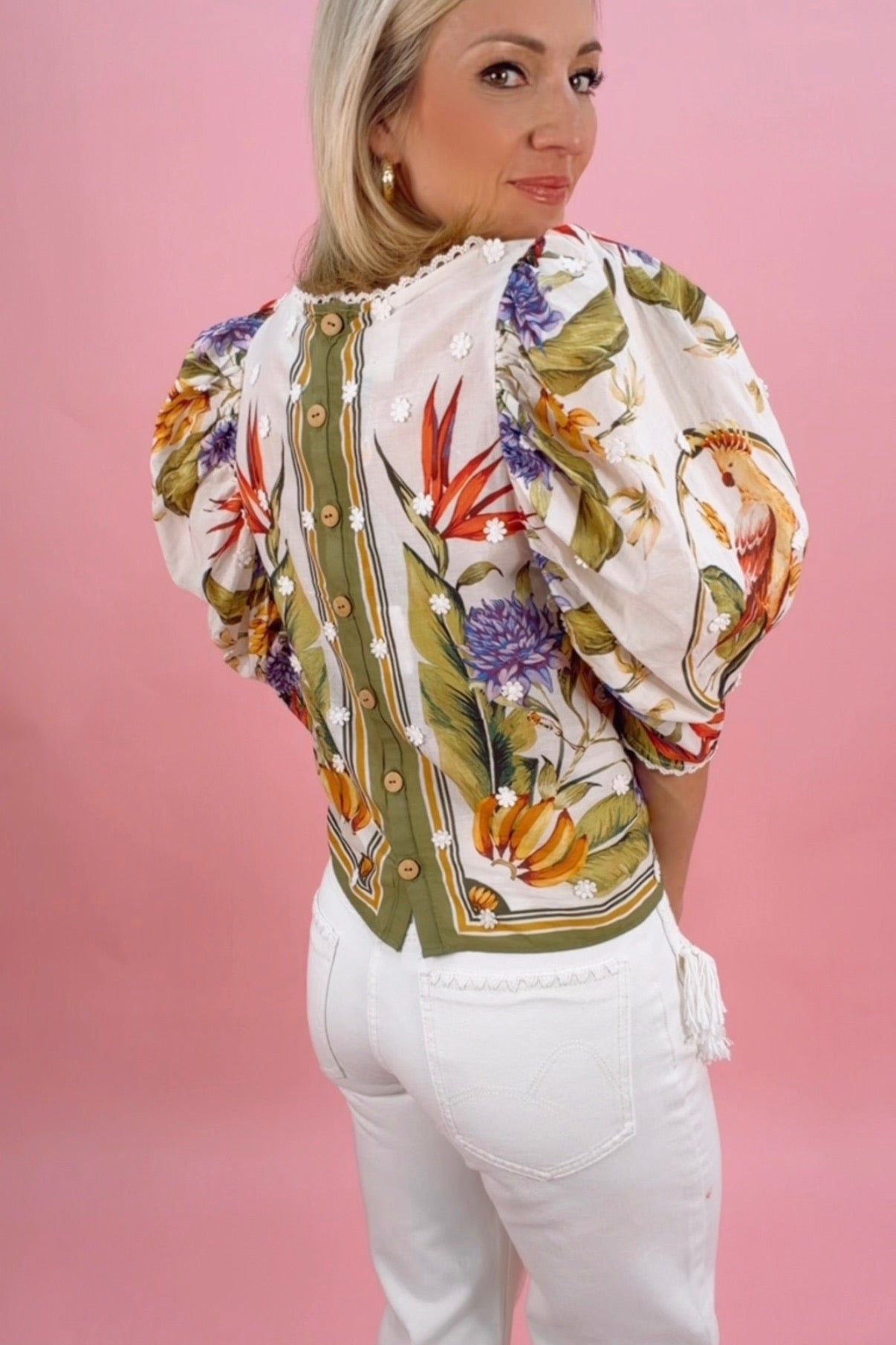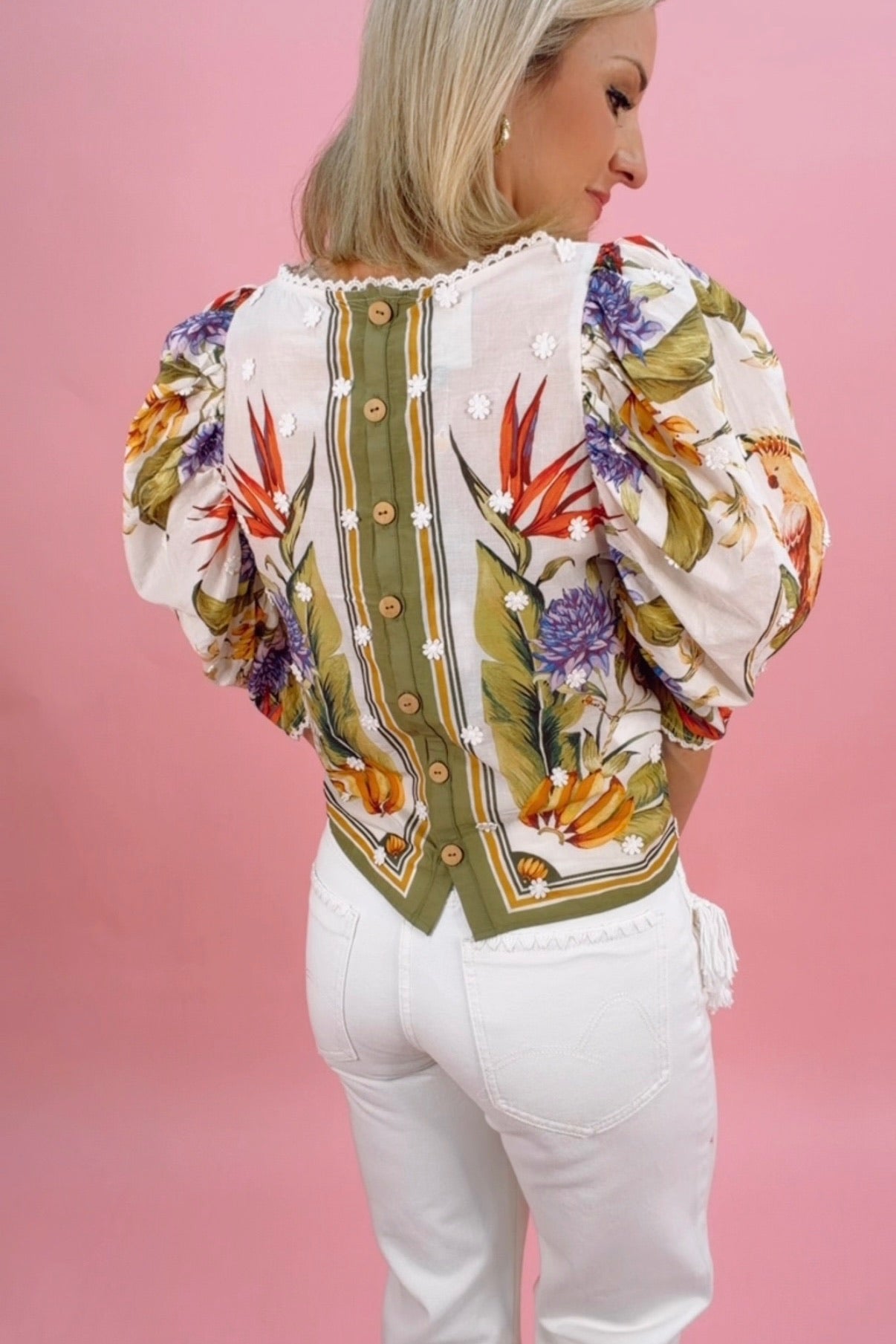 Details: 100% Cotton | Round Neckline | Short Sleeves | Center Back Button Closure | Fluid Drape | Tropical Prints on Sandy Base