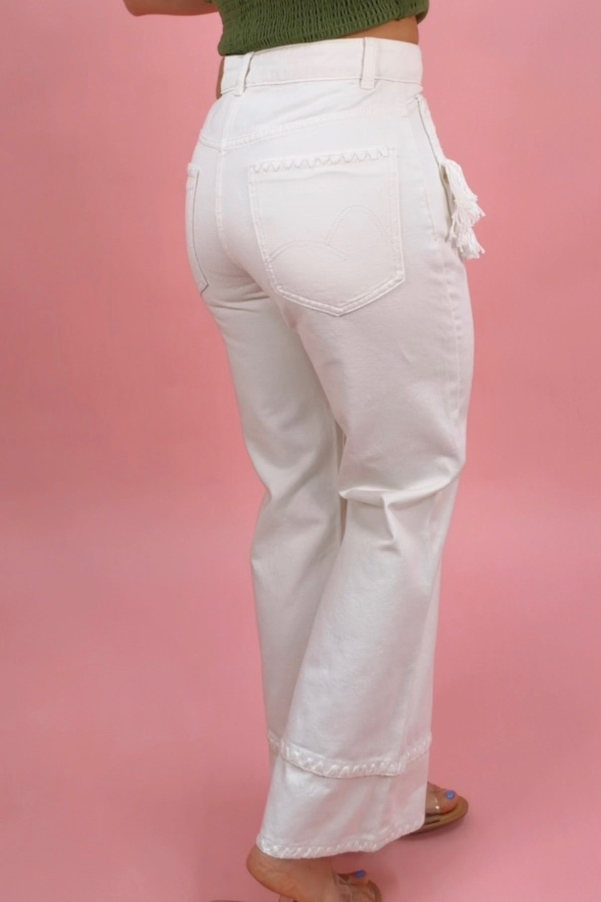Details: Twill Construction | High Waist | Wide Leg | Front Pockets with Fringe Detailing | White