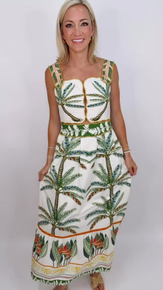 Whether you're pairing with strappy heeled sandals and gold jewelry for a polished summer evening, styling with flat sandals and a woven tote for a breezy daytime look, or wearing with white sneakers for a casual, fashion-forward everyday outfit, the Sydney Tropical Print Cutout Midi Dress delivers that perfect combination of bold tropical energy and refined feminine detail. A dress that makes a statement in the best possible way.